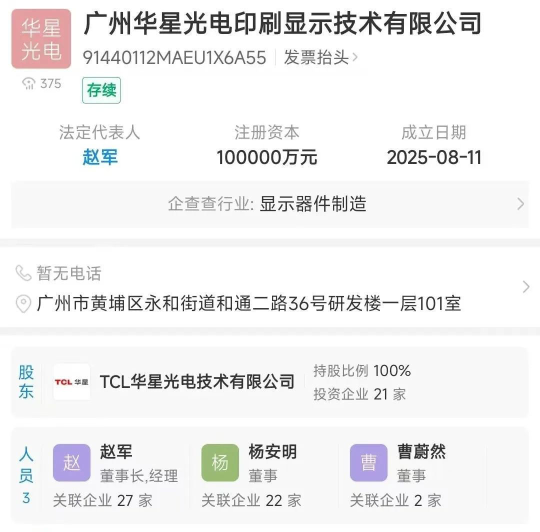 8月14日消息,据天眼查工商信息显示,8 月 11 日,广州华星光电印刷显示技术有限公司正式成立,为显示技术领域注入新活力。该公司法定代表人为赵军,注册资本达 10 亿人民币,其经营范围广泛,涵盖显示器件制造与销售、电子元器件制造与批发、电子产品销售,以及技术服务、开发、咨询、交流、转让和推广等多个领域。