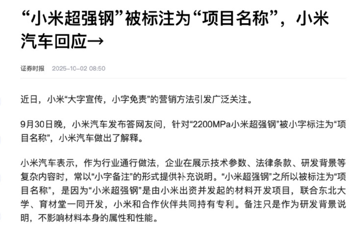 号称全系标配“小米超强钢”,“小米超强钢”却只是项目名称。