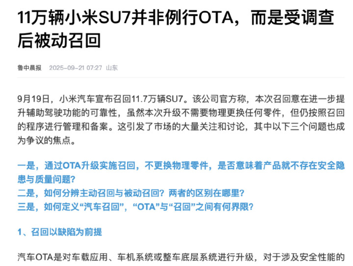 9月份,因辅助驾驶方面的问题,小米汽车在接受调查后,才被动召回11.7万辆汽车,而且只是一次OTA升级,而非物理返厂。