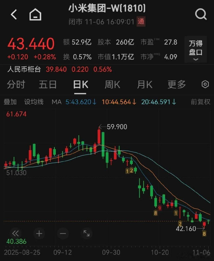 虽然今年上半年小米股价一路高涨,但从6月底开始,小米股价就由涨转跌。9月底至今,小米的累计跌幅已接近25%。
