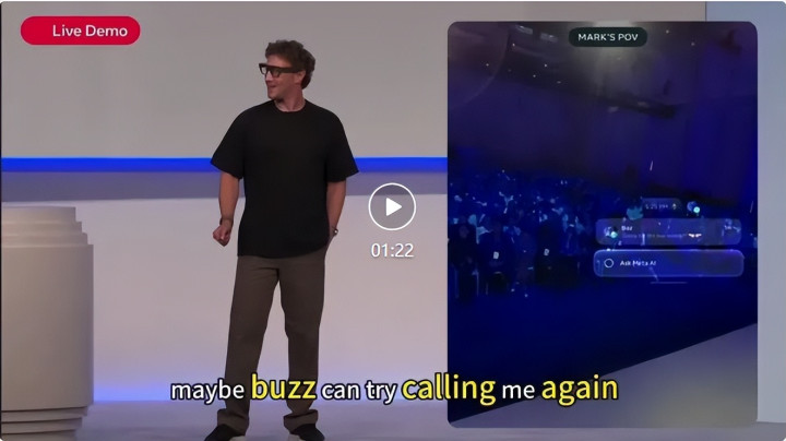 他戴着眼镜和神经连接腕带,试图和他们的 CTO Bosworth 视频通话,结果4次拨打,连续 4 次失败,更滑稽的是,他通话时,铃声在台上“滴滴滴”响个不停,全场笑场。