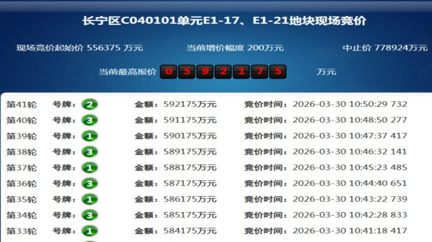 3月30日,长宁中山公园地块经41轮竞价,由保利发展以59.22亿元竞得,溢价率6.43%。这场看似“独角戏”的出让,吸引了华润置地、保利发展、中国金茂三家龙头央企同台竞技。